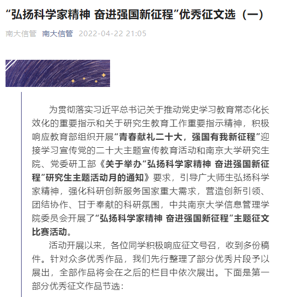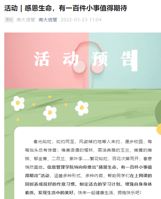 “疫”路同行,“云上”活动活跃校园。学院党委调动各党团学生组织积极性,开展线上活动创意大赛及实践活动。鼓励实验室、课题组策划各类线上活动,学院奖励优秀创意并给予经费支持。而“弘扬科学家精神 奋进强国新征程”主题征文比赛渐入高潮,优秀作品正陆续在“南大信管”微信公众号推出。“阳光生活每一天”线上打卡活动近百人,“有一百件小事值得期待”鼓励同学们感受美好生活,树洞分享和投稿活动记录同学们的“悄悄话”。构筑同心战“疫”心理防线,以党团学生干部、班级心理委员为主要力量,学院精心组织心理情景剧创制工作,生动演绎了在校园疫情防控中辅导员师生经历角色互换后的相互理解和支持。那些看似被疫情“偷走”的青春,正因抗“疫”和奋斗焕发另一种光彩。