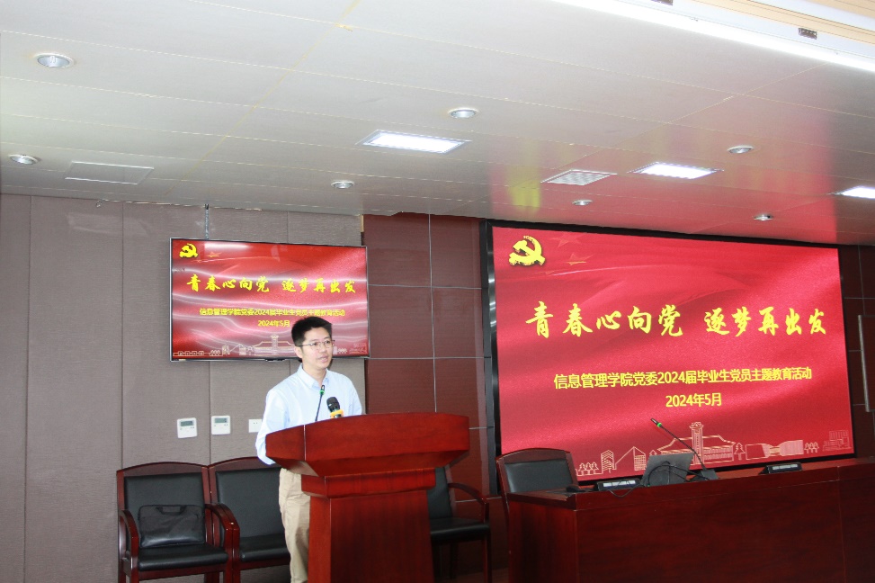 马进军以“知行合一 无悔青春”为题上了一堂精彩的微党课。他首先祝贺在座党员同学顺利毕业,肯定了大家在思想上和政治上的成熟,希望以更加朝气蓬勃的昂扬姿态走好未来人生之路。他结合党纪学习教育的重要性和必要性,代表学院党委着重从三个方面勉励大家:一是牢记党员身份,时刻加强理论学习,树好模范标杆形象;二是坚持学思用贯通、知信行统一,挺膺担当走好人生每一步;三是练就过硬本领,心系母校发展,让业绩成为信管人的亮丽名片。