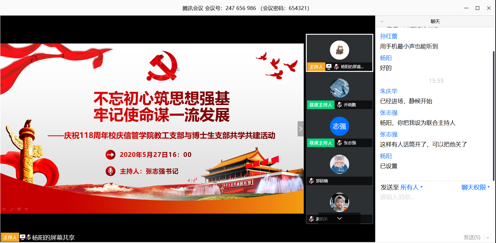 118周年生日,增进师生交流,5月27日下午,信管院教工支部与博士生支部开展了以“不忘初心筑思想强基,牢记使命谋一流发展”为主题的共学共建活动。按照防控要求,此次活动以线上线下相结合的形式开展。学院党委书记姜迎春同志、院长孙建军同志带领部分党员师生代表在院楼211会议室,通过视频连线方式,与教工支部、博士生支部八十余名党员师生共同开展政治学习和业务研讨。党日活动由教工党支部书记张志强同志主持。