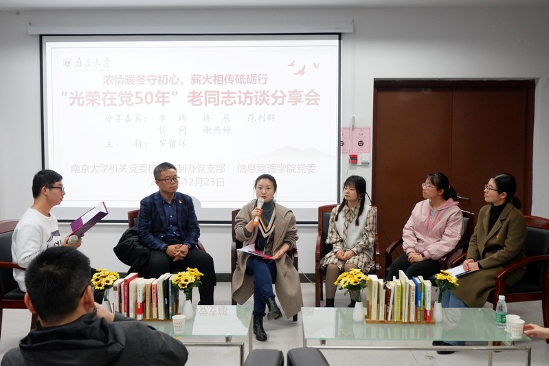 活动第一个环节是“光荣在党50年”老同志访谈分享会,以沙龙对话的形式,重温和分享青年师生对校办法制办支部三位老党员的访谈学习成果。今年7月,校办法制办支部青年党员结对信管学子,对休闲小栈