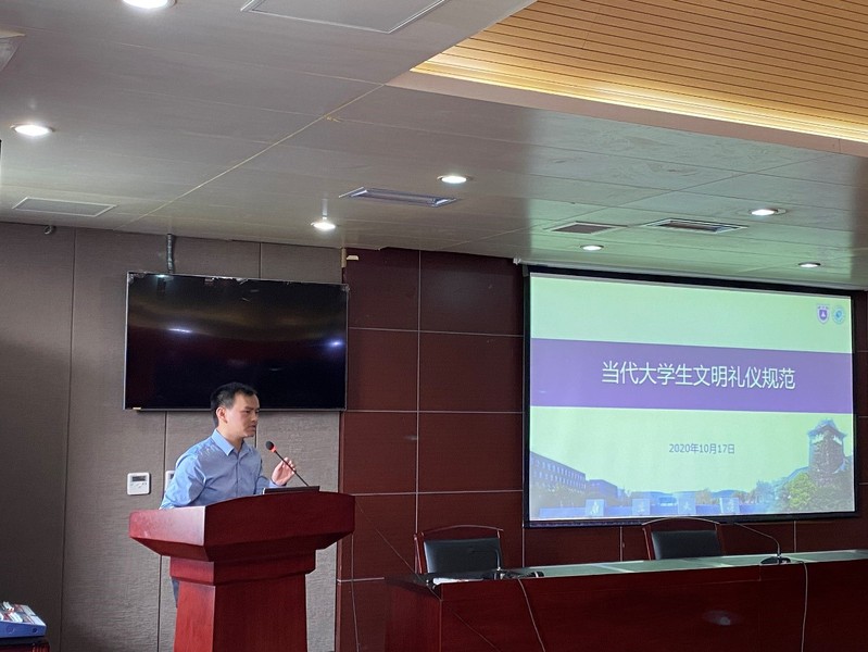 李高杰老师为同学们讲授了课程《大学生日常礼仪规范》。李老师从仪态礼仪、仪容礼仪、仪表礼仪、言谈礼仪等具体方面,结合同学们的学习生活对大学生日常礼仪规范进行了讲解,对同学们的礼仪提出了要求,希望同学们发挥榜样作用,带动更多的同学重视日常礼仪规范。