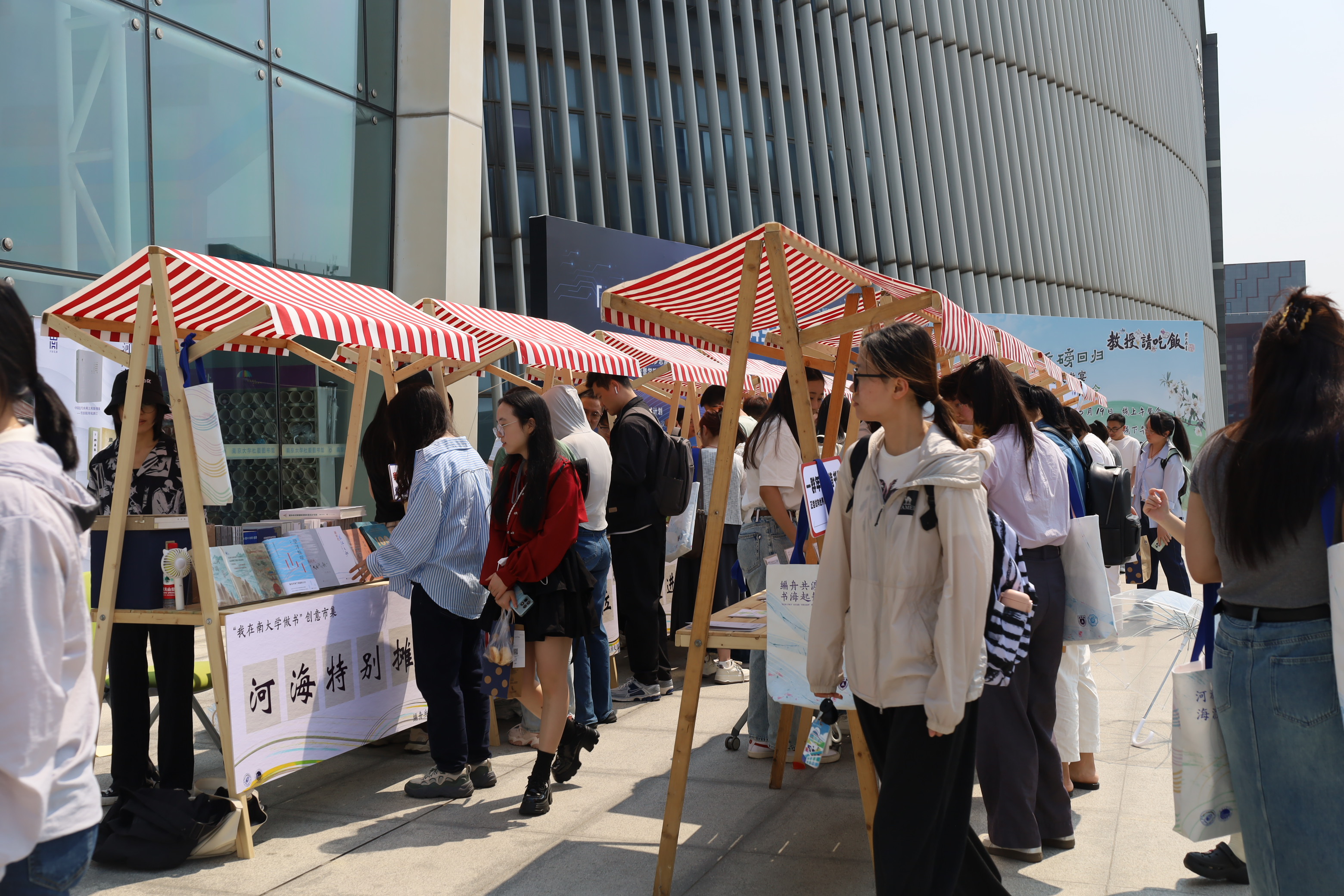 本次书展由出版系学生自主策划、布展,年轻人的活力为展览注入了许多青春力量。展览首日,“图书市集”以五大主题活动吸引师生参与,包括“拼贴诗工坊”“电影盲盒挑战”“字绘她伞”“书籍‘占卜’奇遇”“走进纸张世界”。观众可体验多个互动环节、兑换限定文创。市集摊位由学生全程运营,均以参展作品为素材,将专业知识转化为趣味实践。河海大学出版社亦设立特别摊位,展示来自业界的非凡实力。