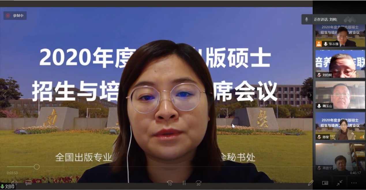 左健教授和王鹏飞教授主持了28家出版硕士培养单位的交流汇报。28家培养单位的负责人分别介绍和总结了本单位在招生办学、核心课程开设、理论和实践教学、国际办学模式探索、毕业生就业等方面的情况,尤其是在新冠肺炎疫情常态化、长期化背景下新的教学培养模式的尝试。