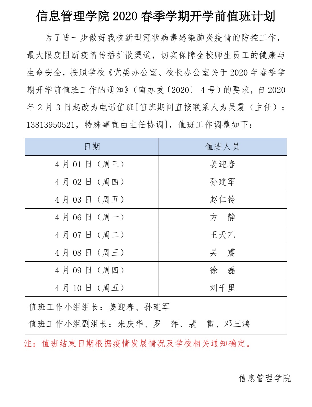 休闲小栈 2020春季学期开学前值班计划(4月份)