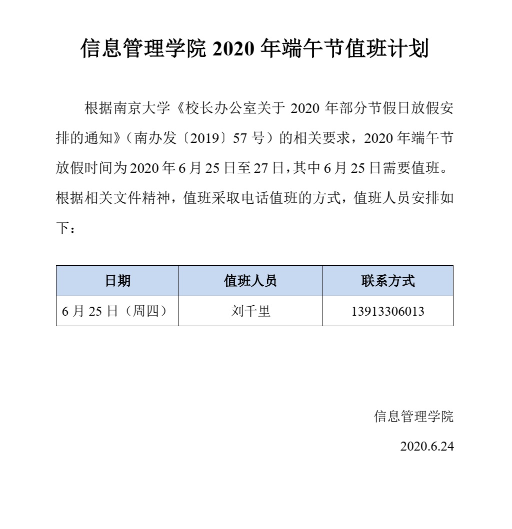 休闲小栈 2020 年端午节值班计划