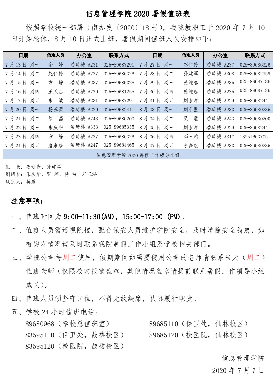 休闲小栈 2020 年暑假值班计划