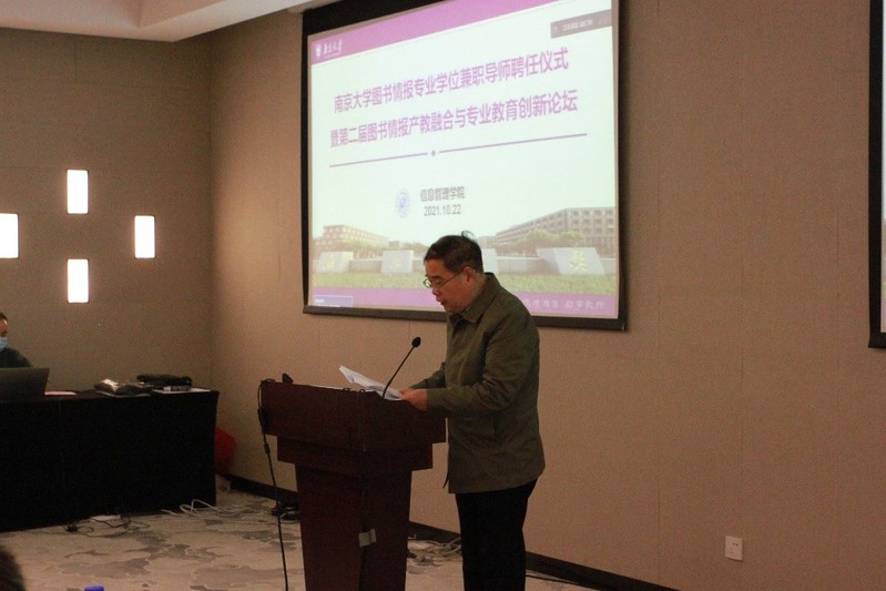 图书情报专业学位兼职导师聘任仪式暨第二届图书情报产教融合与专业教育创新论坛在南大国际会议中心举行。因疫情防控需要,本次大会采取线上线下相结合的方式举行,邀请了来自学界、业界的近十位专家学者以及60余位研究生,大家齐聚一堂,共同探讨学科建设与产业实践的融合发展,以期进一步完善图书情报专业学位师资队伍建设与实践基地建设,全面提升图书情报专业硕士人才培养质量。