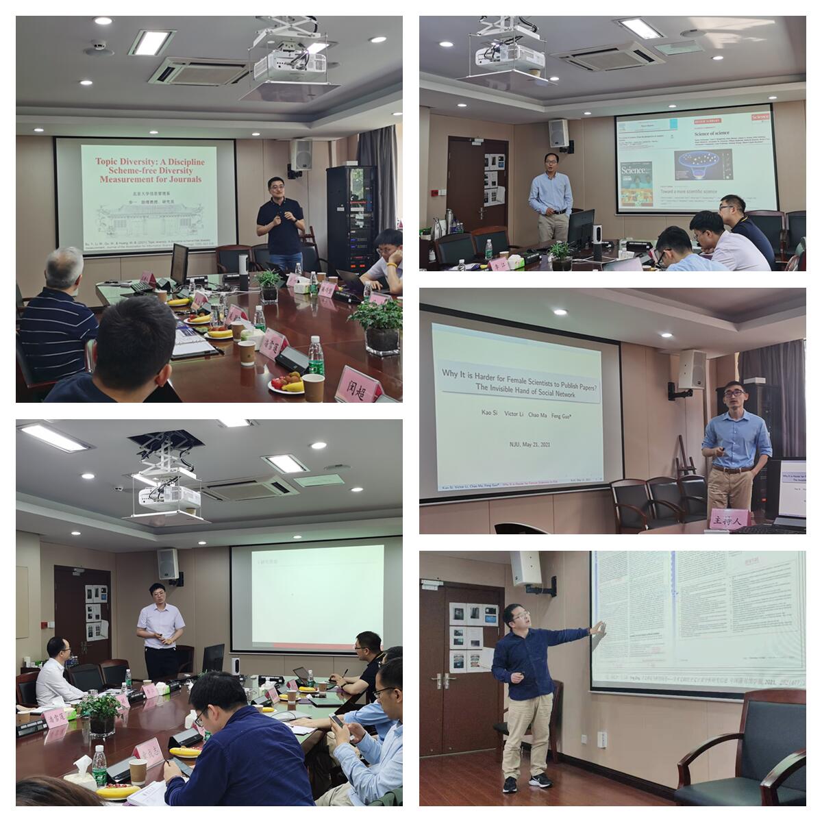 的成颖教授、闵超博士和张家榕博士。研讨主要聚焦了三个方面的主题:科学进展的测度、科学学与科学计量中的因果推断、细粒度科学计量的未来。步一博士、梁兴堃博士、马超副教授、王洋教授、章成志教授分别做了精彩的报告。围绕科学数据,各位青年学者从跨学科的角度进行了热烈而深入的交流。