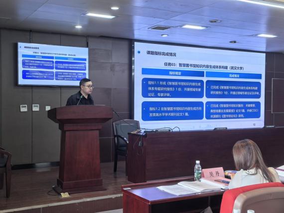 教授赵宇翔作题为“智慧图书馆知识检索体系构建研究报告”的汇报,他从任务书要求、研究报告主要内容、与项目其他任务的支撑关系三方面,向与会专家介绍具体工作情况。