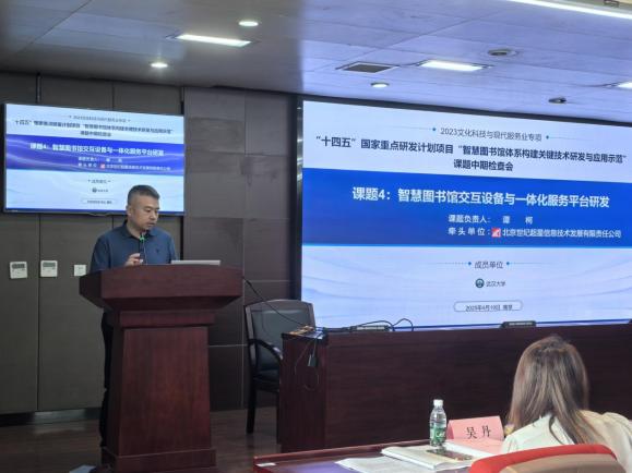 教授赵宇翔、华中科技大学计算机科学与技术学院教授李剑军、北京世纪超星信息技术发展有限责任公司总经理谭柯、国家图书馆研究院院长申晓娟作为各子课题的负责人,就各子课题的任务书要求、中期执行情况、重要研究成果及创新性、财务自查情况与下一阶段工作计划向与会专家汇报。