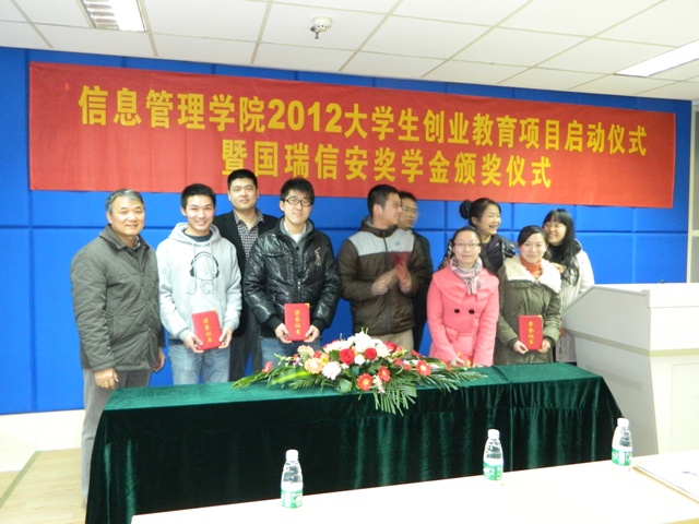 国家保密学院)2012年度大学生创业教育项目启动仪式暨国瑞信安奖学金颁奖仪式在逸夫管理科学楼举行。江苏国瑞信安科技有限公司副总经理唐卫民、公司研究院副院长冷静及校就业创业指导中心职业发展部部长刘颖应邀出席活动。在场的学院领导和老师还有休闲小栈