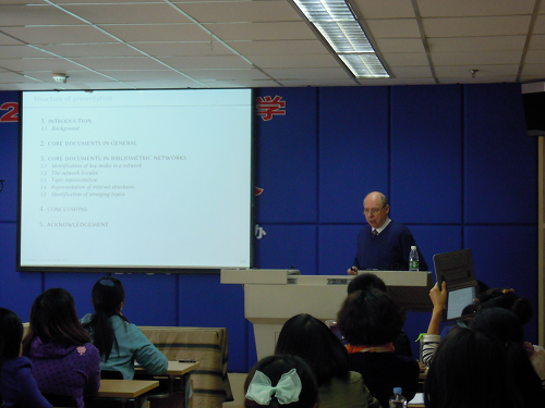 2013年11月13日,比利时鲁汶大学Wolfgang Glänzel教授来访,在鼓楼校区就“核心文献(Core documents)”研究作了学术讲座和研讨。