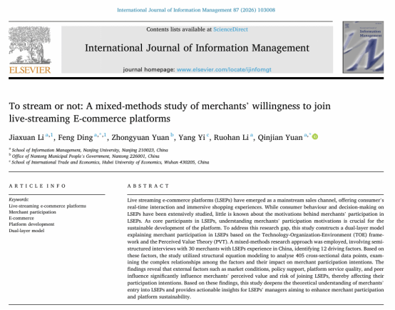 李佳轩和丁凤博士作为共同第一作者(指导老师为袁勤俭教授)的研究成果“To stream or not: A mixed-methods study of merchants’ willingness to join live-streaming E-commerce platforms”,在信息系统国际著名期刊《International Journal of Information Management》(中科院一区Top期刊,JCR一区:Information Science & Library Science类别排名1/166;影响因子27)发表。此文的三位合作者分别是硕士研究生袁中原,李若晗以及易扬。