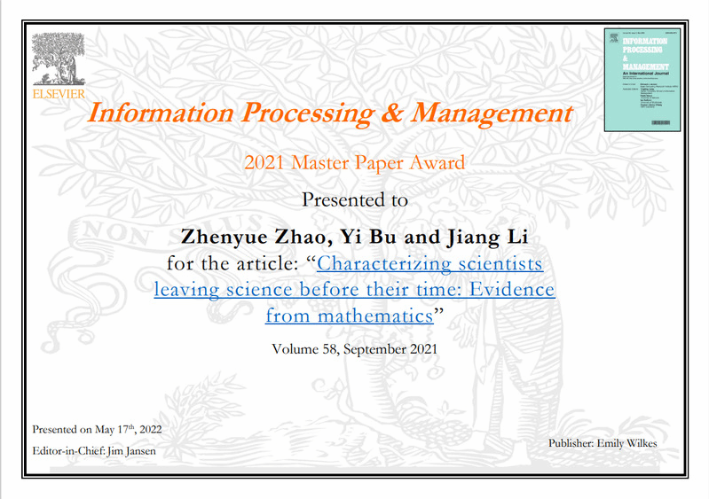 硕士研究生赵镇岳作为第一作者的论文“Characterizing scientists leaving science before their time: Evidence from mathematics”获得期刊Information Processing & Management颁发的2021年度Master Paper Award(最佳硕士生论文奖)。该论文通讯作者为休闲小栈